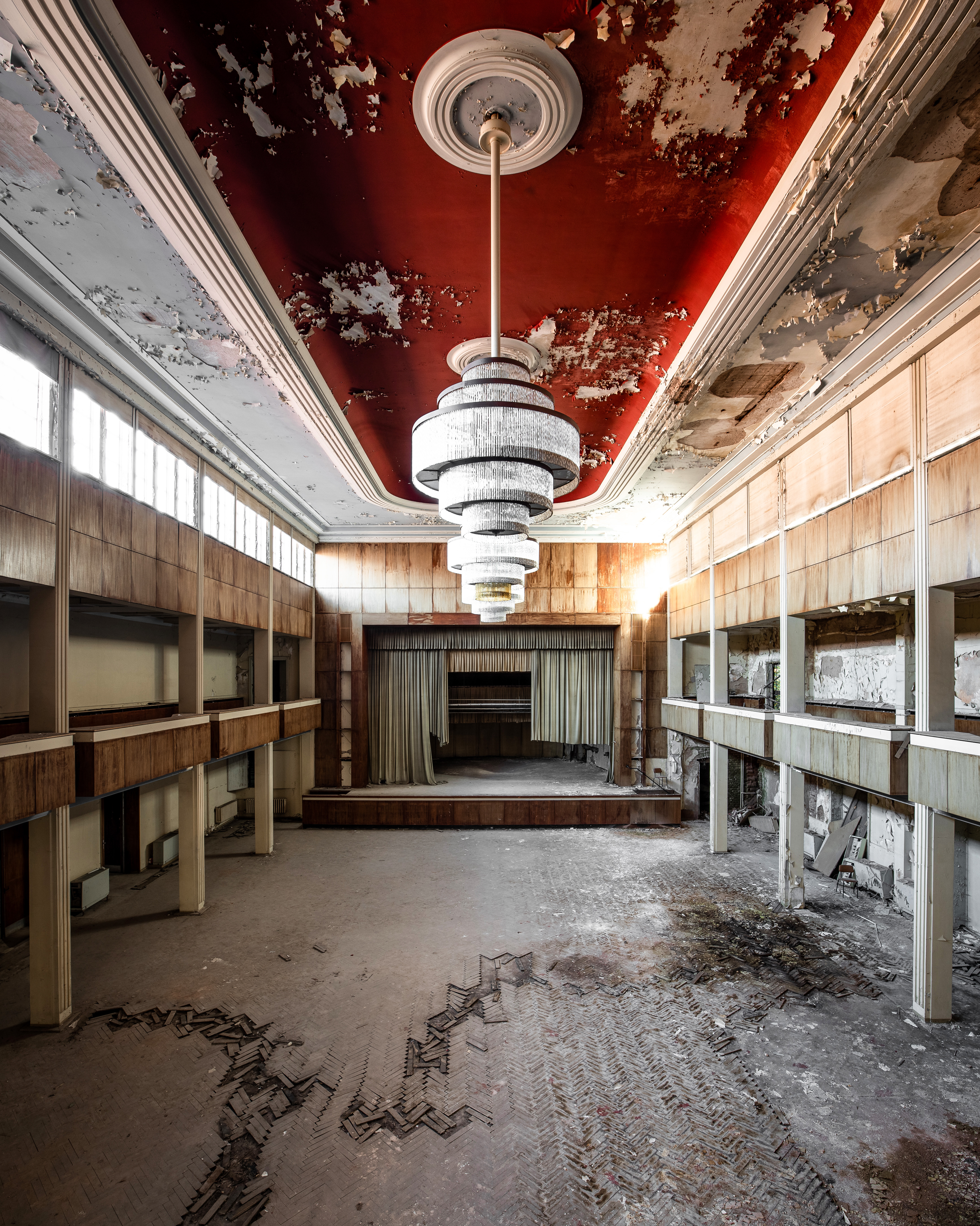 Une immense salle de bal , intact. Le velours rouge passé, les dorures noircies, mais tout était là. Le lustre suspendu au-dessus de la scène, les balcons silencieux, les sièges figés dans l’attente. Une beauté froide, saisissante.