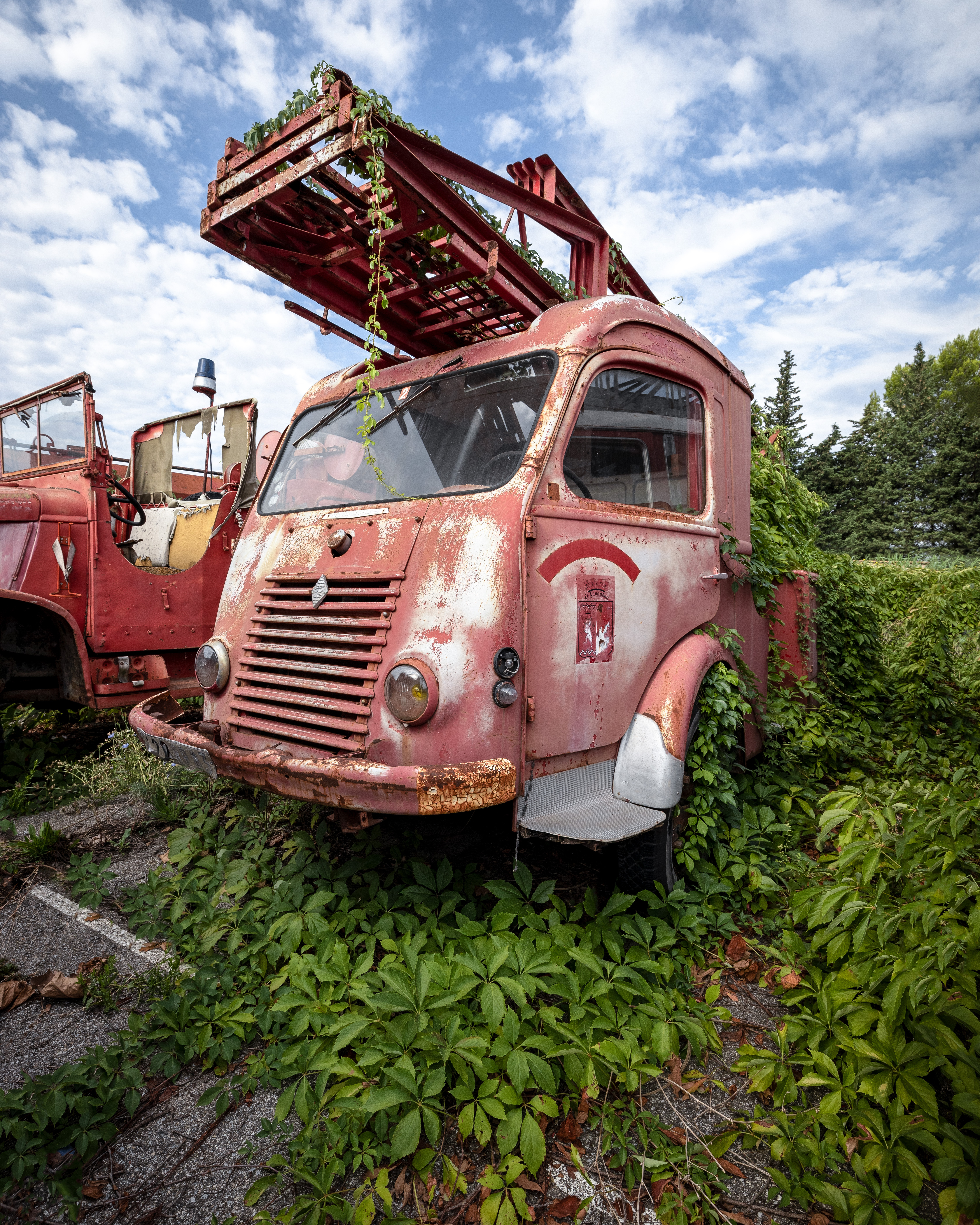 Derrière une ancienne caserne de pompiers, j’ai découvert un lieu hors du temps : un véritable cimetière de camions de pompier, alignés là, rouillés, fatigués… Les pompiers sur place, curieux de mon intérêt, ont accueilli ma visite avec chaleur, me racontant l’histoire de ces véhicules, chacun avec ses missions, ses années de service, ses drames et ses fiertés.